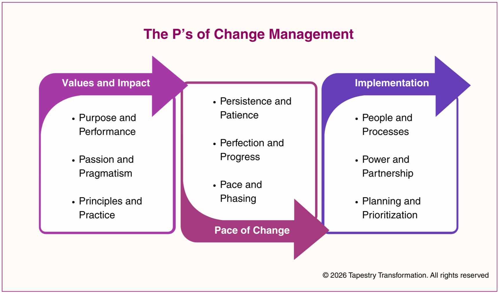 Culture change is not a sprint or a destination. It is a rhythm that requires leaders to sense, adjust, and steward the pace so people can stay engaged, aligned, and resilient. These P’s help leaders manage the emotional and operational cadence of transformation.