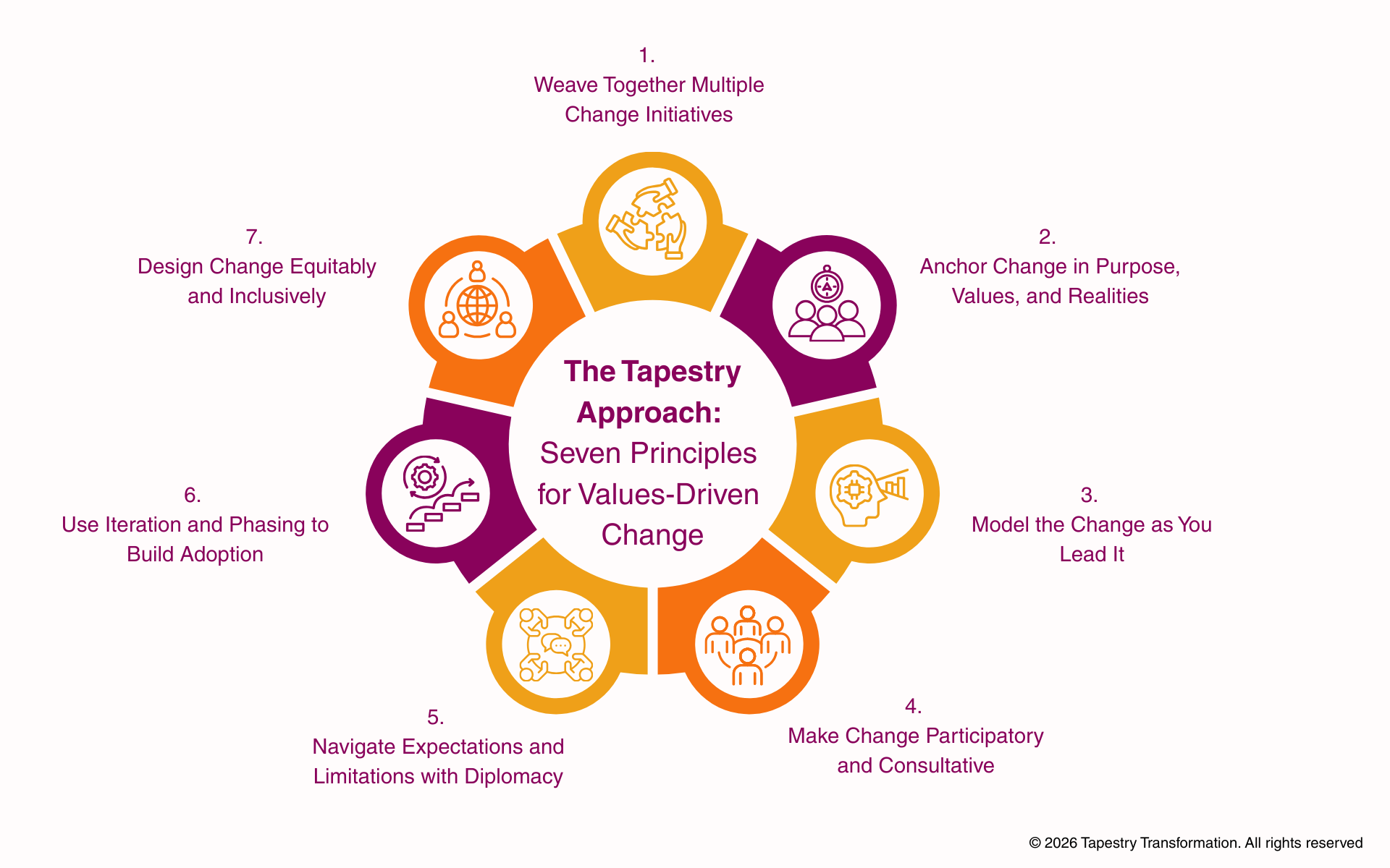 Tapestry transformation is a holistic, values-forward approach to organizational change. It weaves together multiple initiatives, aligns them with purpose and values, and engages people in meaningful ways. It is strategic, human-centered, iterative, and grounded in the belief that organizations thrive when their people, processes, and culture move together.